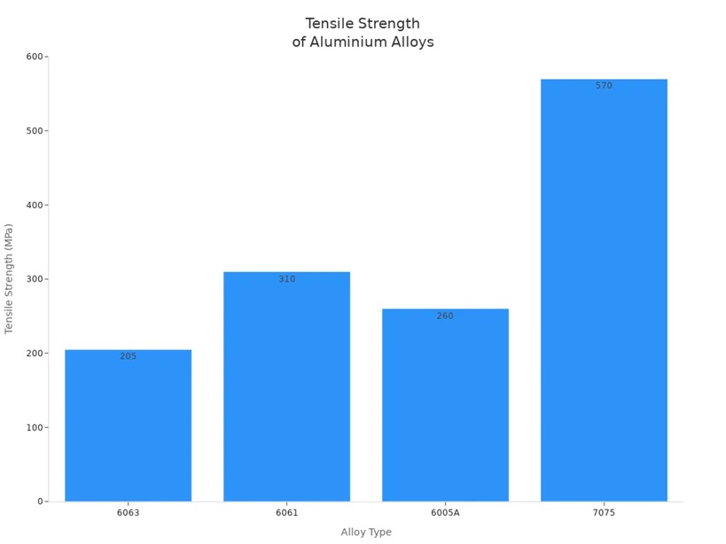 You see clear differences in aluminium profile types and their industrial uses. The table below highlights how alloy choice impacts strength and application:
